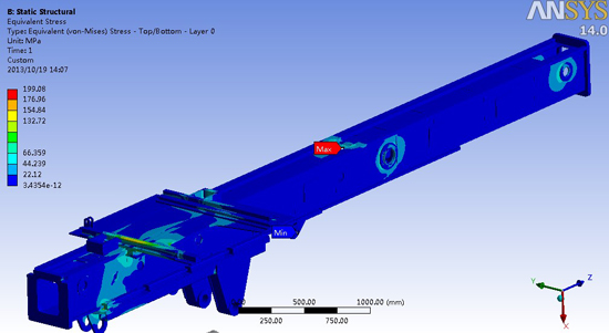 钻具起拔工况应力分布云图如图13所示。最大应力在链条-桅杆上板连接处,为199.08MPa,材料强度安全系数=345/199.08=1.7>1.5,达到了设计要求。