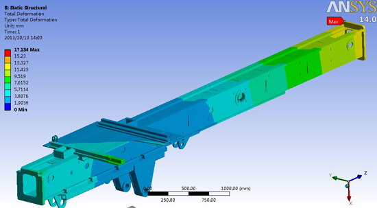 钻具起拔工况变形分布云图如14所示。最大变形为17.13mm,位于中桅杆与上桅杆连接处。中桅杆全长约6700mm,故最大变形量约为3‰,非常微小,满足刚度要求。