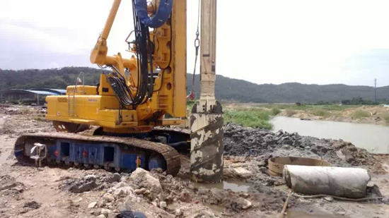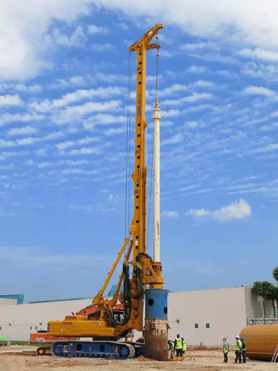 上图为宝峨BG 30 (BH 80) 旋挖钻机在珠海工地,采用护筒驱动器下放1.5米直径、深达16米的钢护筒,并在灌注混凝土后使用驱动器拔出护筒。