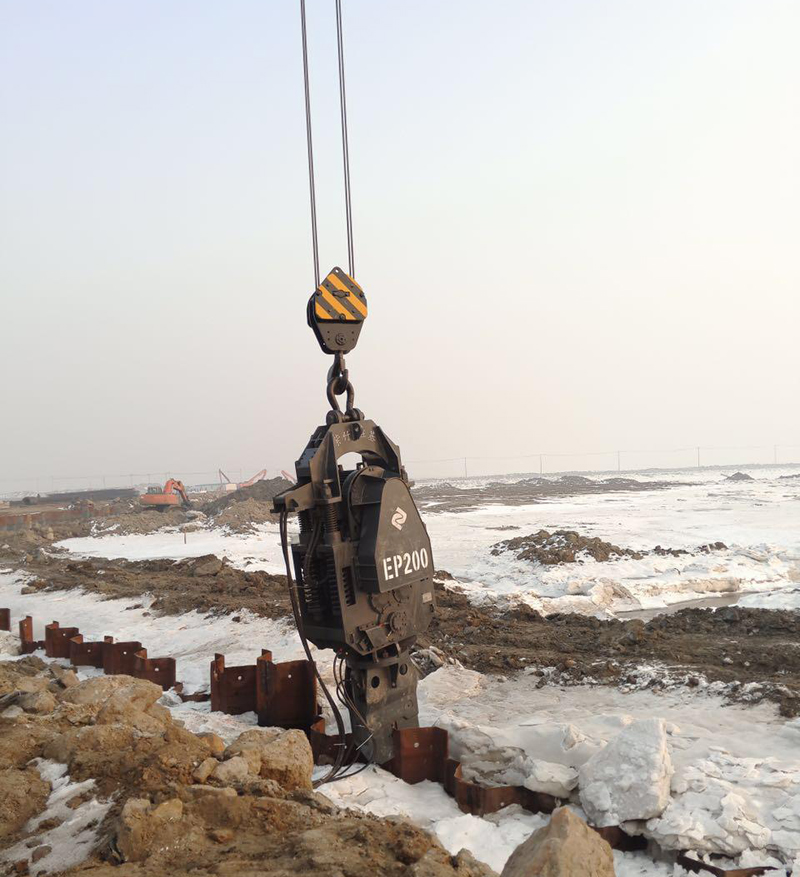 这次施工是进行U型钢板桩支护作业。此处为沉积砾灰岩地层,地质条件复杂,工程要求桩端入土18米,支护全程长度达2千米。面对如此重任,施工人员心里没底,但振中售后服务人员却胸有成竹,随着振动锤的开启,所有疑虑被一扫而光了。在EP200振动锤的轻声振动中,一根根钢桩被打入地下,势如破竹。它们整齐地排列开来,筑成一道钢铁屏障。桩体之上的振动锤犹如一名无畏的战士,傲立于冰雪中。
