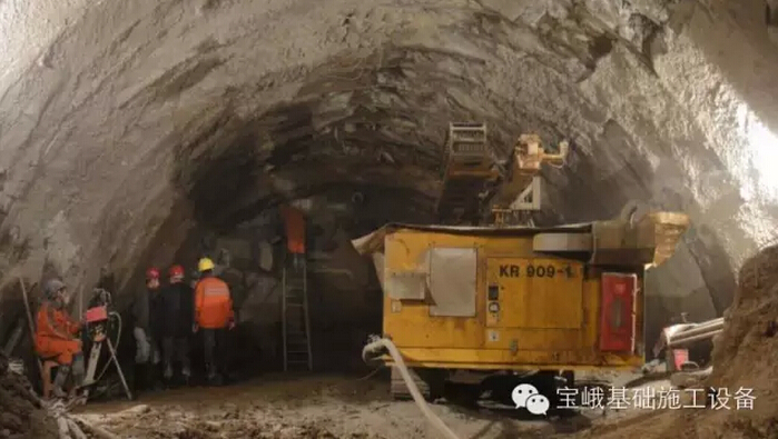 上图为在隧道内进行注浆孔钻进和超前地质钻探的宝峨KR 909-1钻机。