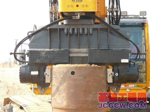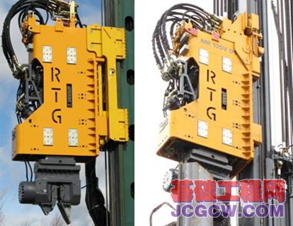 上图为宝峨RG系列钻机配置的、用于钢板桩施工的MR125V振动锤,激振力达1250 KN,最大转速2300转/分钟,夹持力1500KN,功率470KW,自重4.6吨。