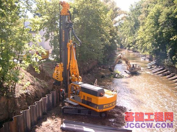 上图为宝峨RG 14T多功能钻机在德国进行河道堤岸治理工程施工