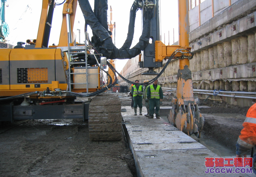 上图为宝峨RG16T(功率571KW)多功能钻机配置MR 125V振动锤在德国柏林附近施工钢板桩