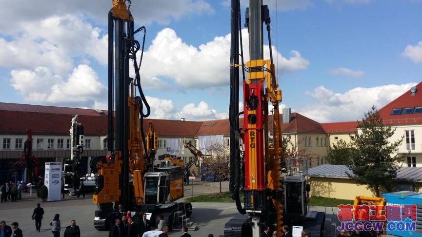 上左图为2015年德国宝峨厂内展览会展出的宝峨RG 19T型多功能钻机,可以采用高频震动锤打入拉森钢板桩,也可用于静压钢板桩、液压打桩锤、双轮铣深搅、大直径较板桩、SMW工法等。上图右为宝峨RM 20型打桩机,该设备配置重力加速式液压打桩锤,可以1.3倍重力加速度高频打入钢管桩和混凝土桩,还可使用大直径潜孔锤打入大直径钢管桩,最大直径1016mm,最大深度20米。
