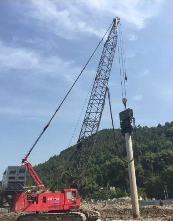 四川省南部县美丽的嘉陵江边的满福坝,是南部县新城规划建设地。一期改造项目采用护筒护壁的工法,共需沉下700余根桩,最大护筒桩桩径为1.35m,设计孔深18.0m。该处地质比较特殊,据当地居民介绍,这片区域是用鹅卵石及岩石堆积起来的。现场提供的地质勘查报告显示:0~10m泥土为主,10m以下岩石及鹅卵石为主,鹅卵石的直径大约在15-500px。故此次护筒桩施工对锤的激振力、静拔桩力等各项参数都有很高的要求。经过前期客户引荐,该客户最终跟荷兰ICE上海公司联系,选择使用815C及1412C液压振动锤,其中1412C的激振力为230吨。