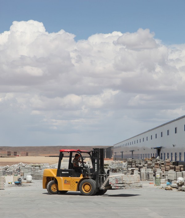 6月的阿勒泰,气候已十分炎热,大朵大朵的棉花云飘荡在万里晴空。我们一行人来到富蕴欧骆石业公司。刚从矿上运下来的花岗岩荒料码在公司广场上,闪着一道道令人艳羡的白光,煞是壮观。欧骆石业是阿勒泰地区石材工业重点龙头企业。在这里,10多台各类型厦工叉车年复一年、日复一日地辛勤工作着。它们主要负责大型石材荒料、成型板材的装卸、搬运等繁重工作。