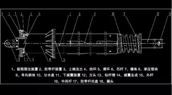 钻杆上的易损件包括:序号14减震环总成、序号17防带杆托盘、序号10弹簧座、序号11减震弹簧。