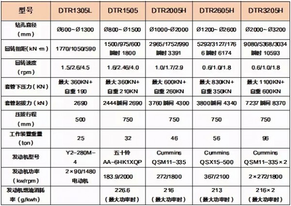 盾安:全套管全回转钻机主要外形尺寸、技术参数一览表