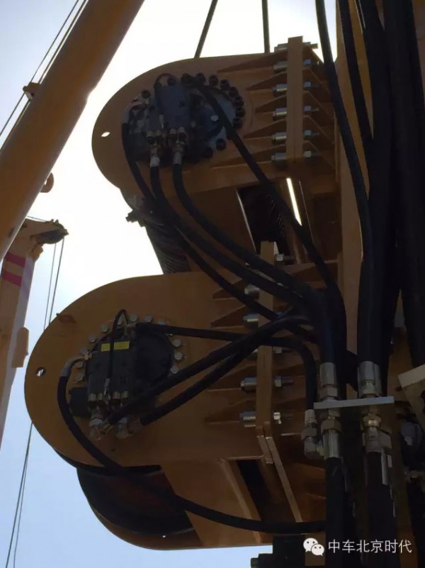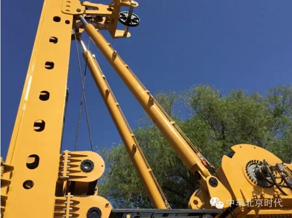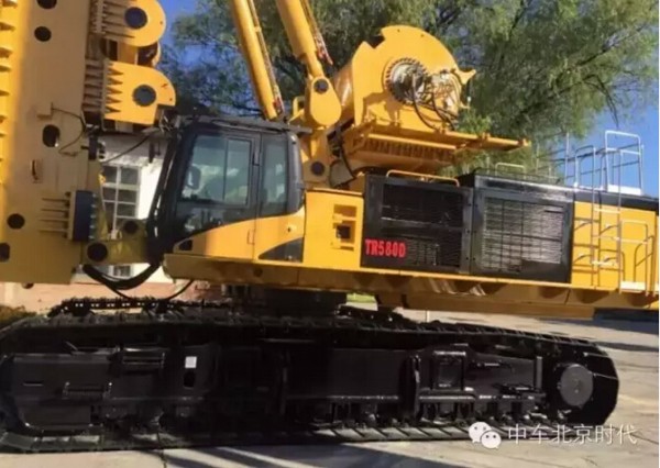此次BICES北京工程机械展,中车北京时代针对用户的切身需求,在TR550钻机基础上升级开发出了超大型TR580型旋挖钻机,TR580D采用的卡特385C定制型底盘,该底盘履带宽1米,发动机功率412kW,液压系统采用先进的负载反馈技术使流量和功率输出分配更合理,采用负载敏感泵和带有负载补偿的多路换向阀,实现泵输出功率与各负荷工况的完美匹配;系统流量达到工作需要时,停止供油,不占用发动机功率,有效节能。