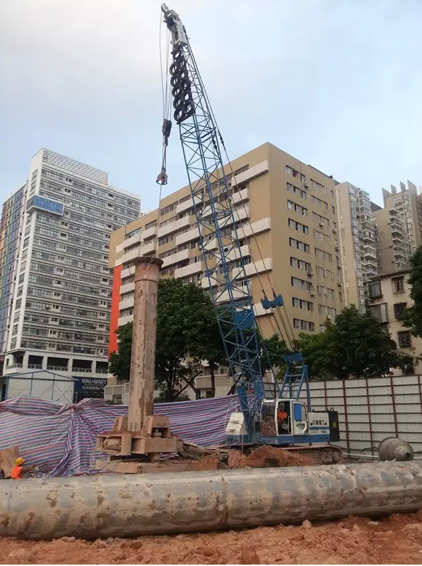 配合能自由落钩的基础施工专用履带吊可实现冲抓斗施工,针对淤泥、湿陷性土壤,冲抓效率高,利用搓管机下压护筒,实现快速成桩。