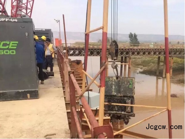 此次的围堰采用钢管桩与拉森桩组合施工,钢管桩直径820mm,长24米;6号U形拉森桩长24米。为了确保该组合桩法在此特殊的黄河土壤地质条件下是适用的,中交二航局主要求试桩。上海友谊路桥先前租赁了一台国产150KW电动锤来试桩,结果只能打到19米,达不到设计深度;这是因为河底下有厚达2米的卵石层,电锤无法使桩穿透它。面对挫折,友谊路桥不得不寻求别的施工手段。 因之前与ICE有过接触,也通过微信新闻了解ICE近期的施工报道,友谊路桥打电话咨询。ICE团队推荐了中等力量的815C液压振动锤;但由于这是向主承包商证明钢管钢板桩组合适用性的最后机会,友谊路桥要求ICE把更大的1412C锤也发去现场。