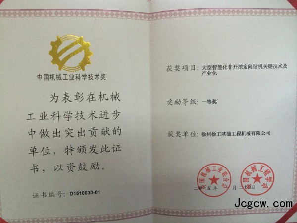 2015年11月20日上午,在南宁隆重举行的“2015年中国机械工程学会年会”上,由徐州徐工基础工程机械有限公司自主研发、拥有六十多项专利技术的“大型智能化非开挖定向钻机关键技术及产业化”因其创造性贡献,荣获中国机械工业科学技术奖一等奖。