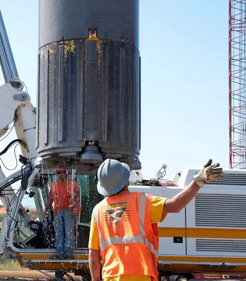 为了达到设计深度和直径,该公司选择分步骤完成钻孔,直到达到基岩时才使用集束式潜孔锤进行钻孔。他们通过在覆盖层用螺旋钻钻孔,安装一系列套管来完成作业。安装的每节新套管比前一节直径略小,长度略长,提供“伸缩”效果。最后是一节63 英尺长,直径为51英寸的套管,直接“坐入”基岩内,为集束式潜孔钻提供气密环。
