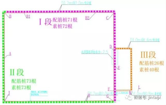 地勘报告揭示,场地内地层主要由人工填土层、有机质黏土、砾质黏性土和粗粒花岗岩等岩化物质组成。工程基坑支护采用一种新型的咬合灌注桩方式,其中直径1.2m咬合桩289根,直径1m咬合桩66根,基坑支护咬合桩共计355根。(具体桩型及分布如下图所示)