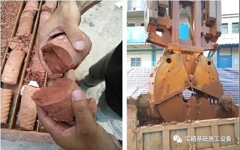 下图为岩芯盒内的粉砂质泥岩及宝峨GB 50液压抓斗直接挖出的红色中风化粉砂质泥岩。