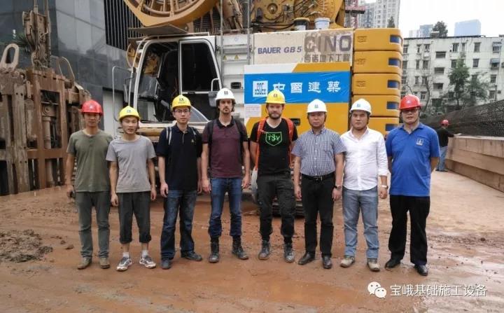 南京市中级人民法院审判业务用房建设项目时间紧、任务重,南京铁义华基础公司比较了各种成槽方案,其中在没有包括旋挖钻机在内的其他任何辅助措施的情况下,采用宝峨GB 50液压抓斗直接挖掘,完成一个1.0米 x 2.8米 x 34米满抓槽段,纯抓时间仅为12小时;而完成一幅6米长的槽段,纯抓28小时即可完成。截止10月25日,共45幅槽,现已完成33幅,占任务73.3% 。按此进度推进,将如期完成全部地下连续墙成槽工作。下图为宝峨国内技术团队、两名德籍专家与客户合影,他们先后多次前往该项目,为客户提供技术支持。
