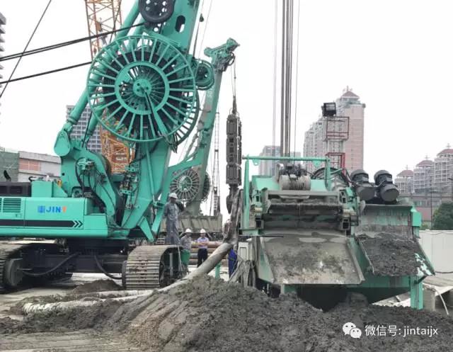2017年5月——杭州地铁五号线人民广场站。槽宽1.0米和1.2米,槽深67米,SX40-A与SG70“抓铣结合”,并配套自主品牌ZR300除砂系统,采用槽口近距离排渣布局,目前两台SX40同时在此地施工。