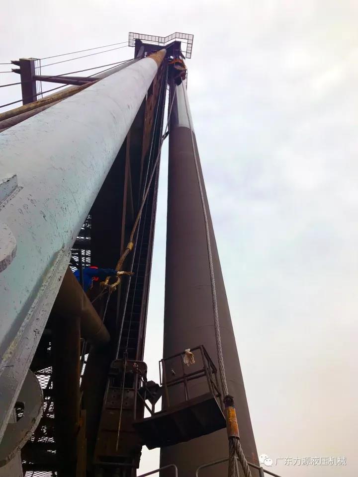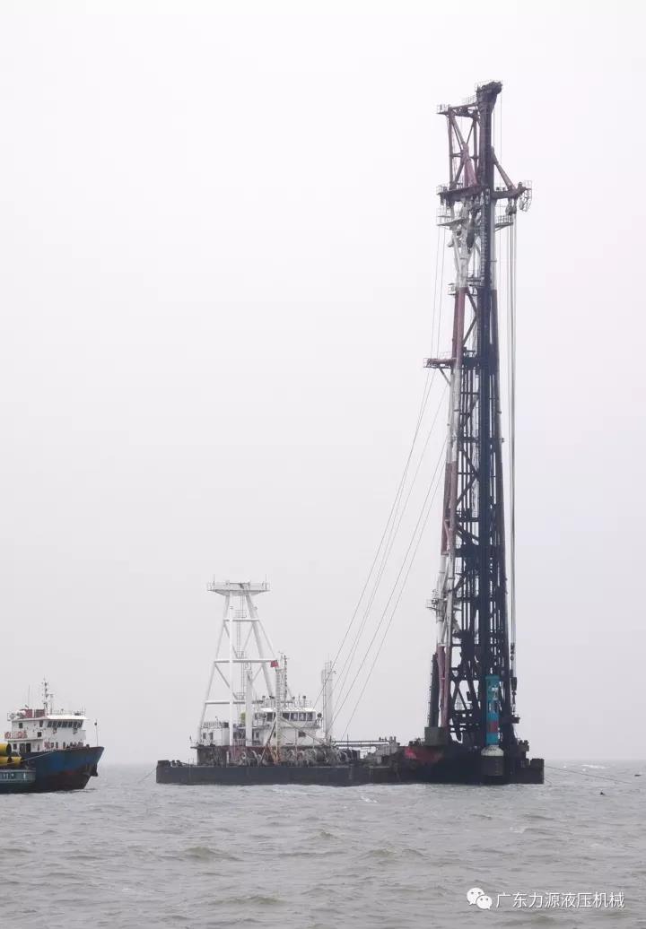 当宁波海港工程的浙桩8号打桩船扬帆出海,HHP40液压打桩锤在船上正密锣紧鼓为试桩做准备的同时,我们遇见了在不远处,舟岱大桥南主通航段上正在施工的HHP35(525kj)液压打桩锤。该锤为中交路桥华东工程有限公司于2013年为港珠澳大桥项目购买的,至今已连续服役5年,为中交路桥顺利完成东雷高速、国台风电等多个高难度桩基础项目,立下多项大功!
