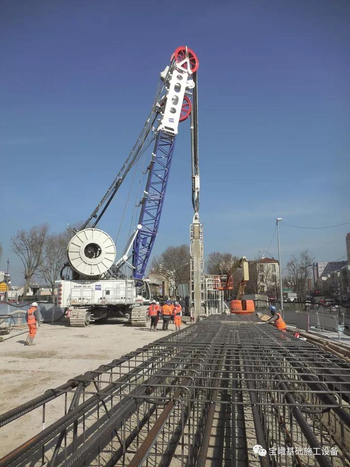 当前,宝峨设备施工的地下连续墙深度达70米,这主要是考虑为将来的地铁车站、通风系统、紧急出口以及隧道掘进机的始发竖井和终端竖井预留足够的深度。该项目所面临的最大挑战之一就是难度很大的地质情况,即:巴黎典型的坚硬、有时成分极为复杂的灰岩层。为了能够解决这些技术难题,法国多家专业基础工程公司选择采用成熟的宝峨产品和技术。宝峨MC 96重载循环工作吊车的大功率柴油发动机和35吨卷扬机确保了最佳的施工效率。除了独特技术特点之外,全方位的优质服务也是客户选择宝峨的重要原因。