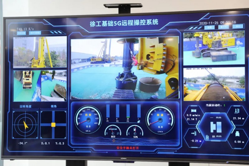 就在11月底刚刚结束的上海Bauma China 2020,徐工信息现场展示了为徐工基础打造“5G悬挖钻远程操控系统解决方案”。在现场展示中,操控台位于上海,旋挖钻机位于直线距离600公里以外的徐州,操控者通过电子显示屏上桅杆角度、压力、扭矩、打火、转速等关键数据进行实时操控,钻机在工地作业的情况便一览无余。