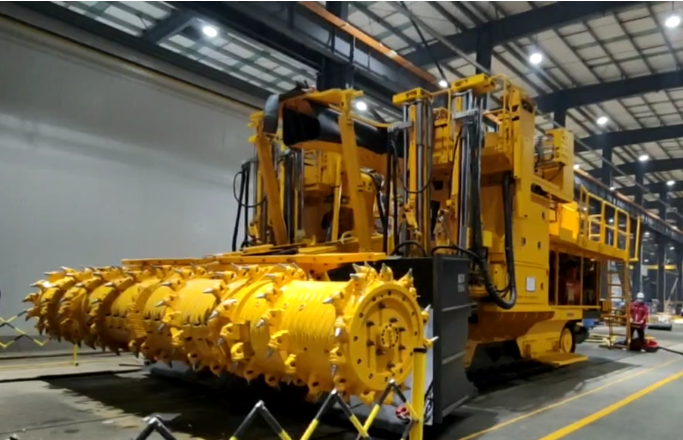 该装备是目前全球作业范围最大的智能快速掘锚成套设备,首创7.5米超大宽度单顺式螺旋截齿+旋叶重型滚筒,截割功率从270千瓦提升至540千瓦,截割能力达到每分钟30吨,实现巷道一次截割成形;构建了“掘锚同步、时空协同、平行作业”的掘锚一体化工艺流程,设备配备13台3.6米/2.6米大行程多自由度锚杆钻机,实现一次定位、分区平行作业,扩大了支护范围,提升了支护效率,确保了支护质量。整机配套高效率、高耐磨、高可靠输送系统,输送能力达到每分钟36吨。