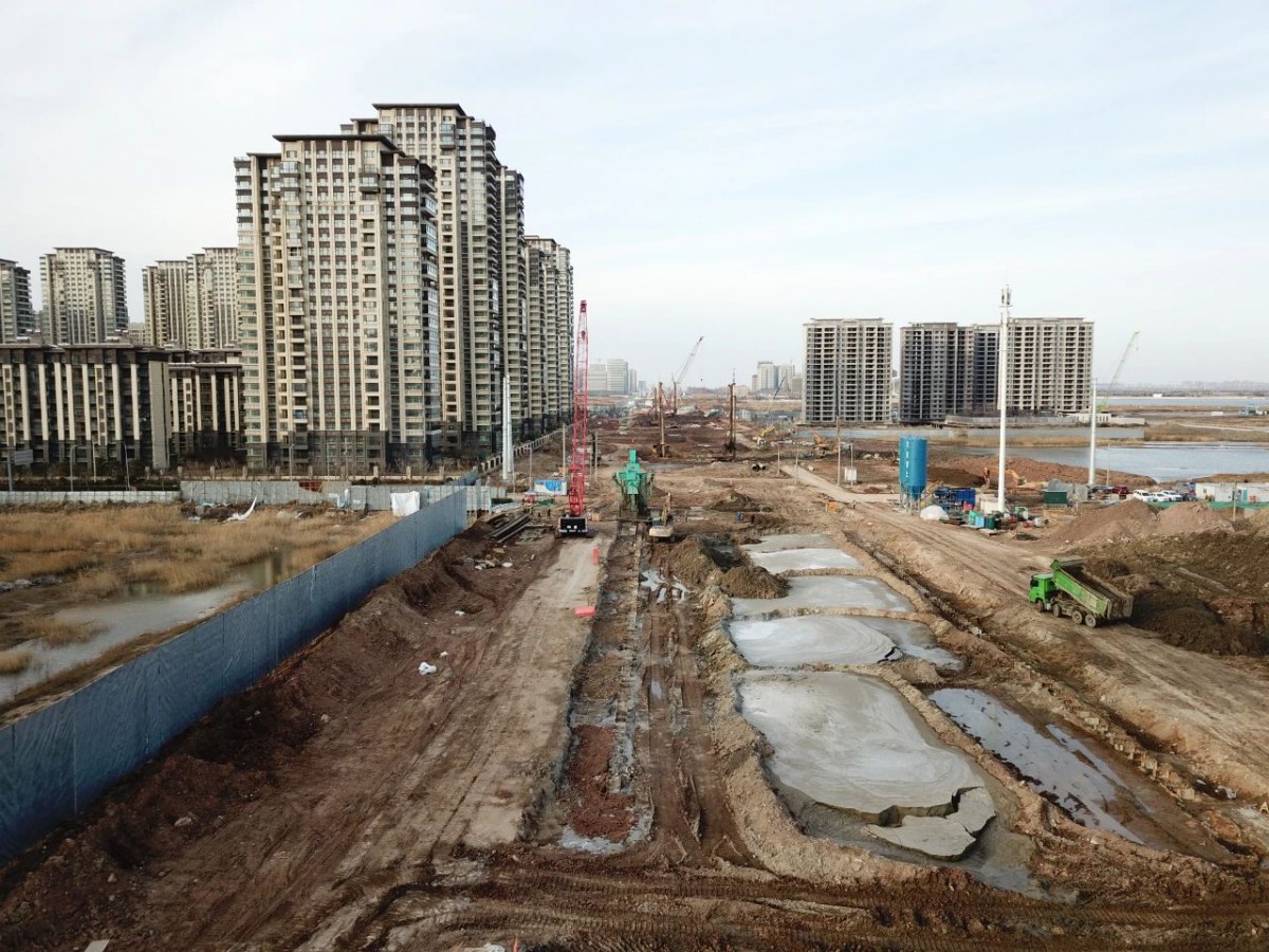 项目现阶段拟将现状交大大道挖除后开发地下空间,开挖深度约 10~11m,下部为地道工程,上部为道路工程(含配套 管线) ,同步翻建现状跃进河的桥梁工程,“鉴于交大大道沿线广泛分布淤泥质土层,又靠近胶州湾海边,自稳定性较差,开挖存在较大风险,该地道工程围护结构采用了TRD水泥搅拌墙加混凝土支撑,钢支撑形式。”