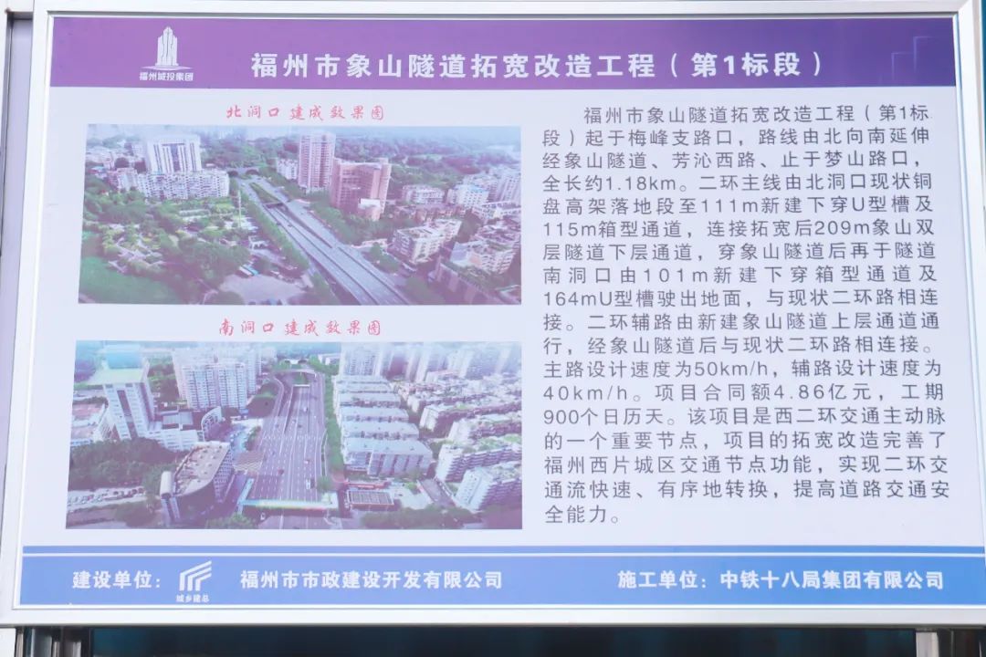 福州市象山隧道拓宽改造工程 (第1标段 )起于梅峰支路口,路线由北向南延伸经象山隧道、芳沁西路、止于梦山路口,全长约1.18km。该项目是西二环交通主动脉的一个重要节点,项目的拓宽改造完善了福州西片城区交通节点功能,实现二环交通流快速、有序地转换,提高道路交通安全能力。