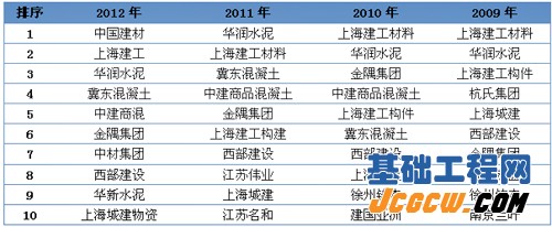 2009-2012年,水泥企业发展混凝土产业的步伐逐年加快,从2009年的仅有华润水泥、金隅集团名列混凝土产量十强,到2012年占具6大席位,发展可谓迅速。据统计,2012年混凝土产量10强中的水泥企业产量达7693万立方米,占十强产量的67.61%,成为名副其实的混凝土业的主力军。