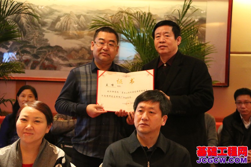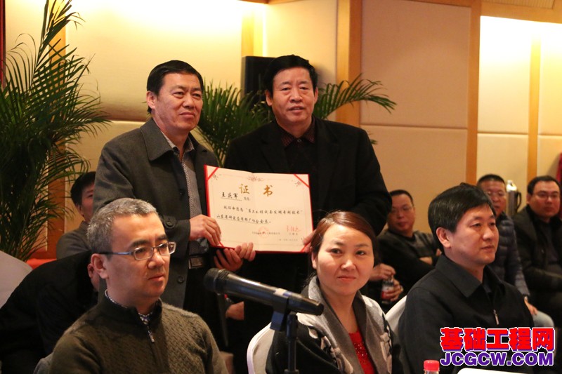 北京波森特岩土工程有限公司董事长王继忠为“岩土工程成套发明专利技术”山东省研究应用推广协会会长王庆军颁发证书