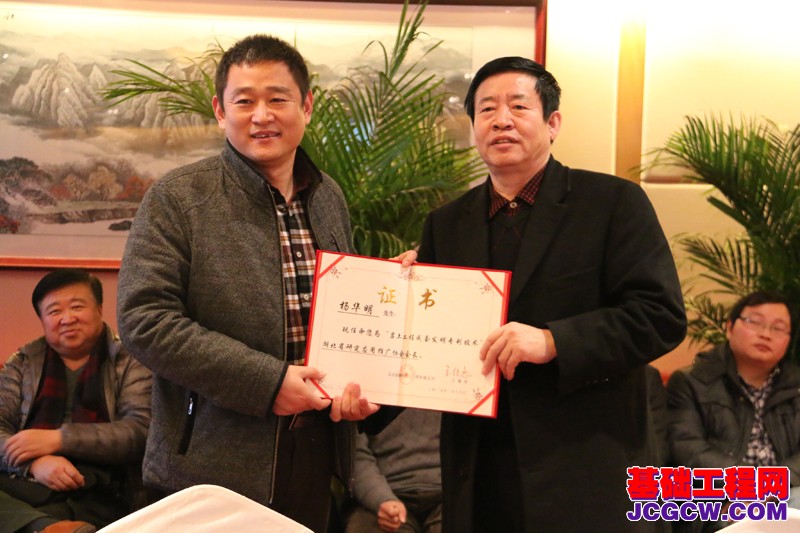 北京波森特岩土工程有限公司董事长王继忠为“岩土工程成套发明专利技术”湖北省研究应用推广协会会长杨华明颁发证书