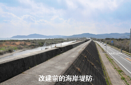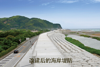 工程名称:NINO海岸堤防改建工程。工程地点:日本高知县高知市春野町。施工时间2012年8月至11月。作为日本的地震?海啸防护对策,该工程对位于太平洋一侧的四国高知海岸堤防工程进行加固改造,以应对今后发生率极高的东南海?南海大地震所可能带来的巨大海啸灾害。