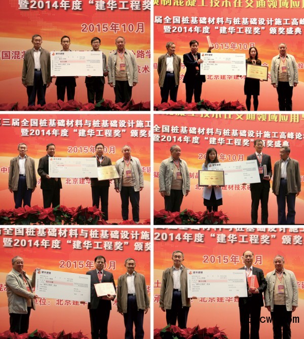 《基础工程》杂志社、基础工程网特别报道 2015年10月31日,第三届全国桩基础材料与桩基础设计施工高峰论坛暨2014年度“建华工程奖”颁奖大会在北京新大都饭店国际会议厅举行。会议由中国混凝土与水泥制品协会、中国公路学会、建华建材投资有限公司主办,北京建华建材技术研究院有限公司承办。整个会议包括颁奖大会和高峰论坛两部分。