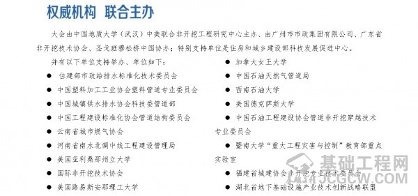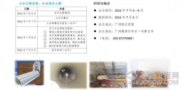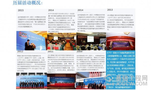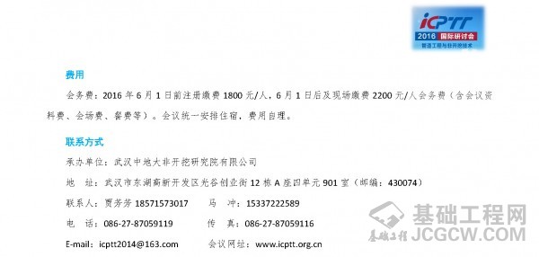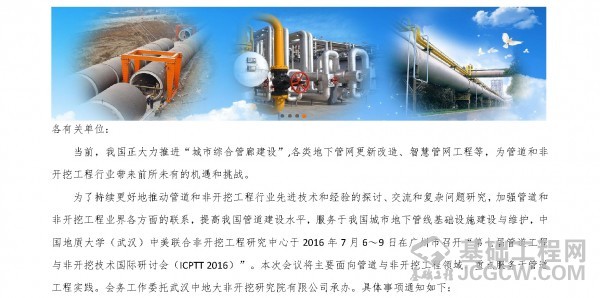 为了持续更好地推动管道和非开挖工程行业先进技术和经验的探讨、交流和复杂问题研究,加强管道和非开挖工程业界各方面的联系,提高我国管道建设水平,服务于我国城市地下管线基础设施建设与维护,中国地质大学(武汉)中美联合非开挖工程研究中心于2016年7月6~9日在广州市召开“第七届管道工程与非开挖技术研讨会(ICPTT 2016)”。本次会议将主要面向管道与非开挖工程领域,重点服务于管道工程实践。