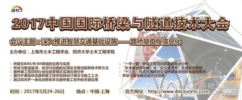 为提升我国桥隧建设整体安全水平和促进桥隧行业创新和可持续发展,2017(第六届)国际桥梁与隧道技术大会将于2017年5月25-26日在上海召开,本届大会以“深入推进基础设施工程信息化”为主题,将汇聚800余位国内外路桥隧工程行业的高层及精英共襄盛会,关注路桥隧重大工程项目,从产业链各个环节进行探讨,切实推进路桥隧学术研究与技术创新。同期举办2017中国国际桥梁与隧道工程技术装备展,为国内外业内人士搭建首屈一指的展示平台,更好的推动我国路桥隧技术的发展。