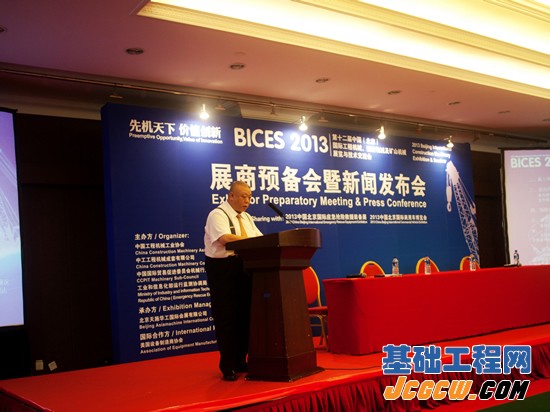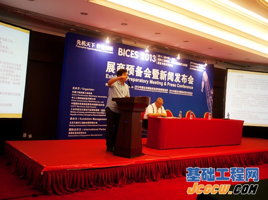 第十二届(中国)北京国际工程机械、建材机械及矿山机械展览与技术交流会(BICES 2013)于7月4日在展会举办地北京九华国际会展中心召开展商预备会暨新闻发布会,会议由工业和信息化部运行监测协调局领导景晓波先生就作为同期举办的应急抢险救援装备展主办单位之一作了重要发言,中国工程机械工业协会(CCMA)副会长兼秘书长、北京天施华工国际会展有限公司(BAICE)总经理苏子孟先生对工程机械行业运行进行了分析和阐述了BICES 2013的重大举措,中工工程机械成套有限公司(CNCMC)董事长黄晓敏先生就BICES 2013 筹备工作做了详细介绍,上午会议由中国国际贸易促进委员会机械行业分会(CCPIT-MSC)副会长周卫东先生主持;下午会议由北京天施华工国际会展有限公司展览处处长李勇凯先生主持并对展览运营工作进行了介绍,同时,由北京集佳知识产权代理有限公司律师张亚洲先生对参展知识产权保护注意事项进行了讲解,BICES 2013室内主场服务商北京鑫赛克展示服务有限公司BICES项目负责人姬鑫颖经理及室外主场服务商北京双通展览有限公司BICES项目负责人蔺梅经理分别对展会主场搭建规范、展场交通安排进行了说明,中国外运北京公司会展服务分公司作为BICES的运输供应商由毕波副总经理对展品运输作了说明,百年梦想文化传播(北京)有限公司总经理费楠作为BICES的广告招商方也向参会人员作了本届展览的广告方案。