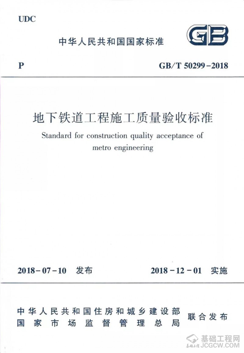 国家标准《地下铁道工程施工标准》GB/T 51310-2018、《地下铁道工程施工质量验收标准》GB/T 50299-2018已于2018年7月10日由住房和城乡建设部、国家市场监督管理总局联合发布,2018年12月1日起实施。标准实施后,原国家标准《地下铁道工程施工及验收规范》GB 50299-1999(2003版)同时废止。