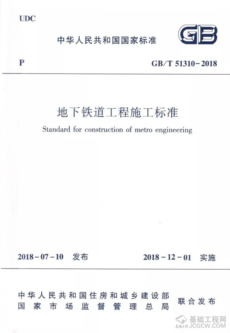 核心提示: 各有关单位: 国家标准《地下铁道工程施工标准》GB/T 51310-2018、《地下铁道工程施工质量验收标准》GB/T 50299-2018已于
