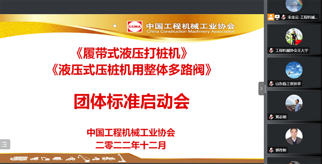 2022年12月22日,中国工程机械工业协会(以下简称:协会)组织召开了两项桩工机械团体标准启动会视频会议。两项标准分别是由山东临工工程机械有限公司牵头起草的《履带式液压打桩机》,于2022年4月批准立项(计划号为:JH-2022-003);由山河智能装备股份有限公司牵头起草的《液压式压桩机用整体多路阀》,于2022年5月批准立项(计划号为:JH-2022-009)。目前两项团体标准(草案)均已完成。