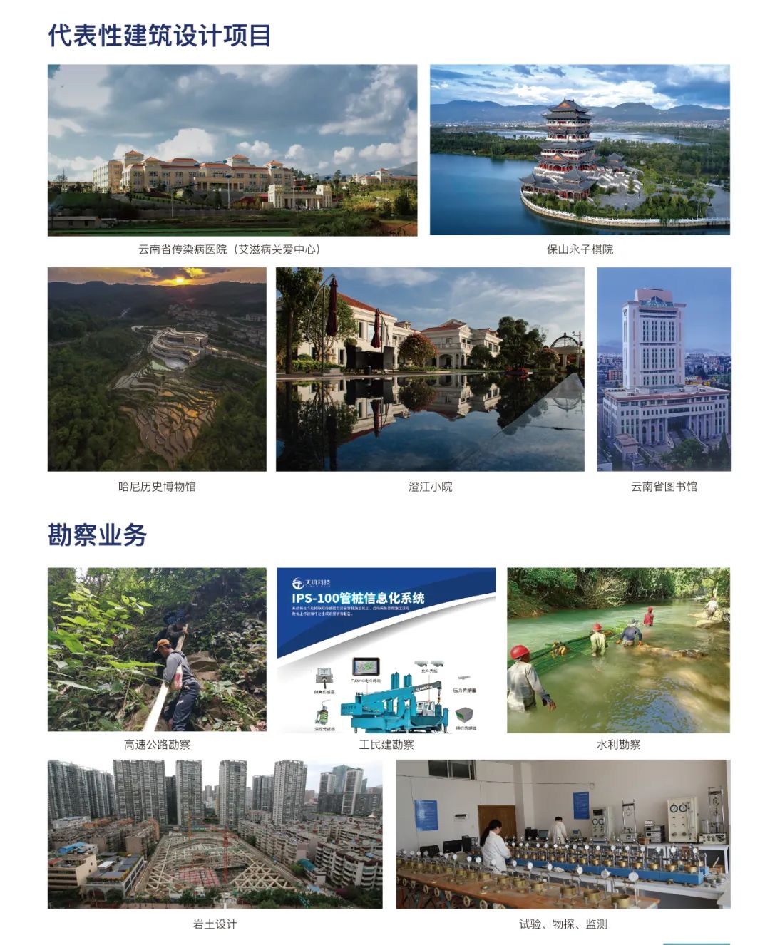 公司业务范围包括:工业与民用建筑设计、建筑装饰工程设计、建筑幕墙工程设计、轻型钢结构工程设计、建筑智能化系统设计、照明工程设计、消防设施工程设计、园林景观设计、城乡规划编制、市政工程设计、公路行业设计等资质相应范围内的专项工程设计业务,以及工程地质勘察及地基处理、危房加固与改造、工程技术咨询、工程项目可行性研究报告编制、勘察土工试验C类,勘察—类、房建设计一类施工图设计文件审查,可从事资质证书许可范围内相应的建设工程总承包业务以及项目管理和相关的技术与管理服务。工程项目遍及云南省各地(州)、县(市),并进入多个省(自治区)以及西亚、东南亚和非洲市场,完成工程设计项目涵括机场枢纽、交通设施、行政办公、医疗卫生、教育场馆、电信枢纽、文化体育、小区住宅、棚户区改造、保障房建设、易地扶贫建设等较多大型公用及民用建筑。