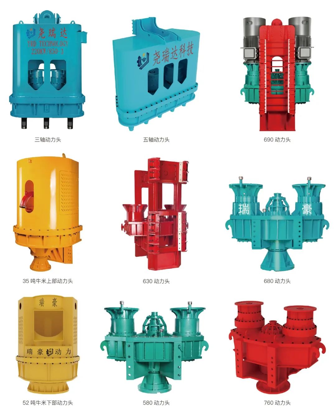 公司主营的产品有:三轴钻、五轴钻搅拌桩动力头 850 型、650 型,大扭矩长螺旋上部动力头、下部动力头、双行星传动减速机760型、690型、670型、630型、580 型、480型、560 型、450型、430型、350型等。瑞豪动力的产品品质精良,具有噪音低、低耗能、高效能、质量稳定、产品耐用等特点。公司所有产品都是自主研发、生产,可根据用户的需求定制特殊规格。