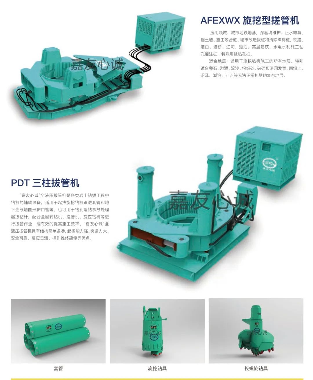 北京嘉友心诚工贸有限公司成立于 2006 年,是家专业从事特种桩基础、地基及深基础钻机、矿业勘探及开采设备及其配套钻具钻杆、附属件设计、制造、贸易于一体的高科技企业,产品涵盖基础施工、深基坑处理、地质勘查、矿业勘探等领域。公司生产制造的各种设备和器具已形成产业化、系列化,具备成批配套供应能力。主要产品有全液压搓管钻机、全液压回转套管钻机、锚杆钻机、截桩机、拔管机、孔底动力马达、旋挖钻具、长螺旋钻具、正反循环钻具、全套管 (跟进护筒) 、钻进泥浆材料及设备、环保及废水处理设备系列斗齿、截齿和各种切削具等。
