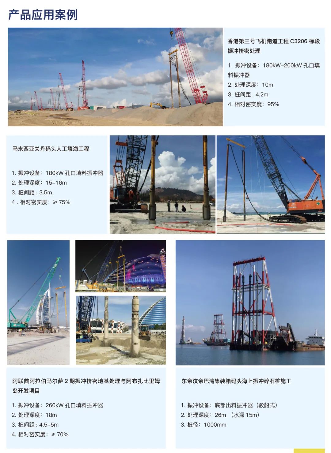 振冲机械拥有规模化、数控自动化生产流水线,常规振冲设备已形成从30KW至260KW的系列产品。国内设备销售已占据市场份额的70%以上,国外市场已开拓柬埔寨、索马里兰、东帝汶、黎巴嫩、印度尼西亚、迪拜、沙特、巴拿马、厄瓜多尔等多个国家。设备已成功应用于曹妃甸原油码头及配套设施振冲工程、马来西亚关丹码头人工填海工程、北京新机场口岸非现场设施工程、北京城市副中心职工周转房工程、重庆万州新田河综合治理碎石桩工程、援黎巴嫩国家高等音乐学院等工程项目中。高性能底部出料振冲设备及全过程质量控制仪,已成功应用于港珠澳大桥香港入境口岸人工岛海上干法底部出料振冲工程及东帝汶帝巴湾新集装箱码头干法底部出料振冲工程中,均实现了海上自动化振冲施工、全过程数据记录。