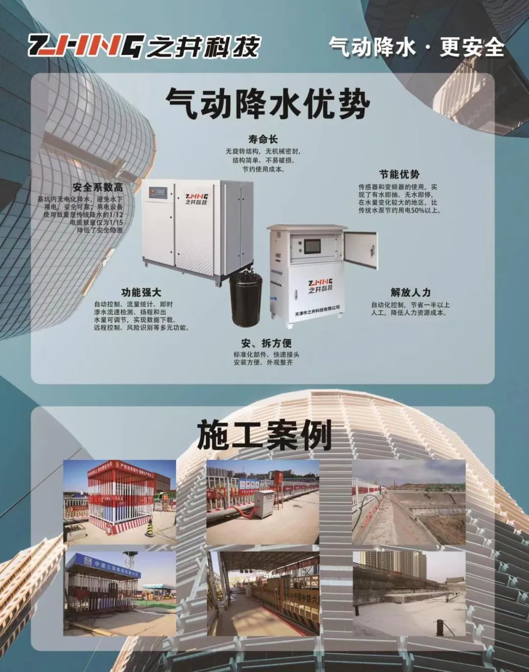 随着城市化建设的深入,地下空间被广泛的利用。在全国大部分地区,地下空间开发过程中,降水施工是一项必不可少的措施。之井科技针对降水施工中,电动潜水泵易损坏、现场布线杂乱、频繁开停浪费人力物力等现象,开发研制出了自动化气动降水设备告别了以往依靠潜水泵组合体(包括潜水泵、电闸箱、电缆线、水表)降水的时代,使管井降水由粗放型迈向集约型。