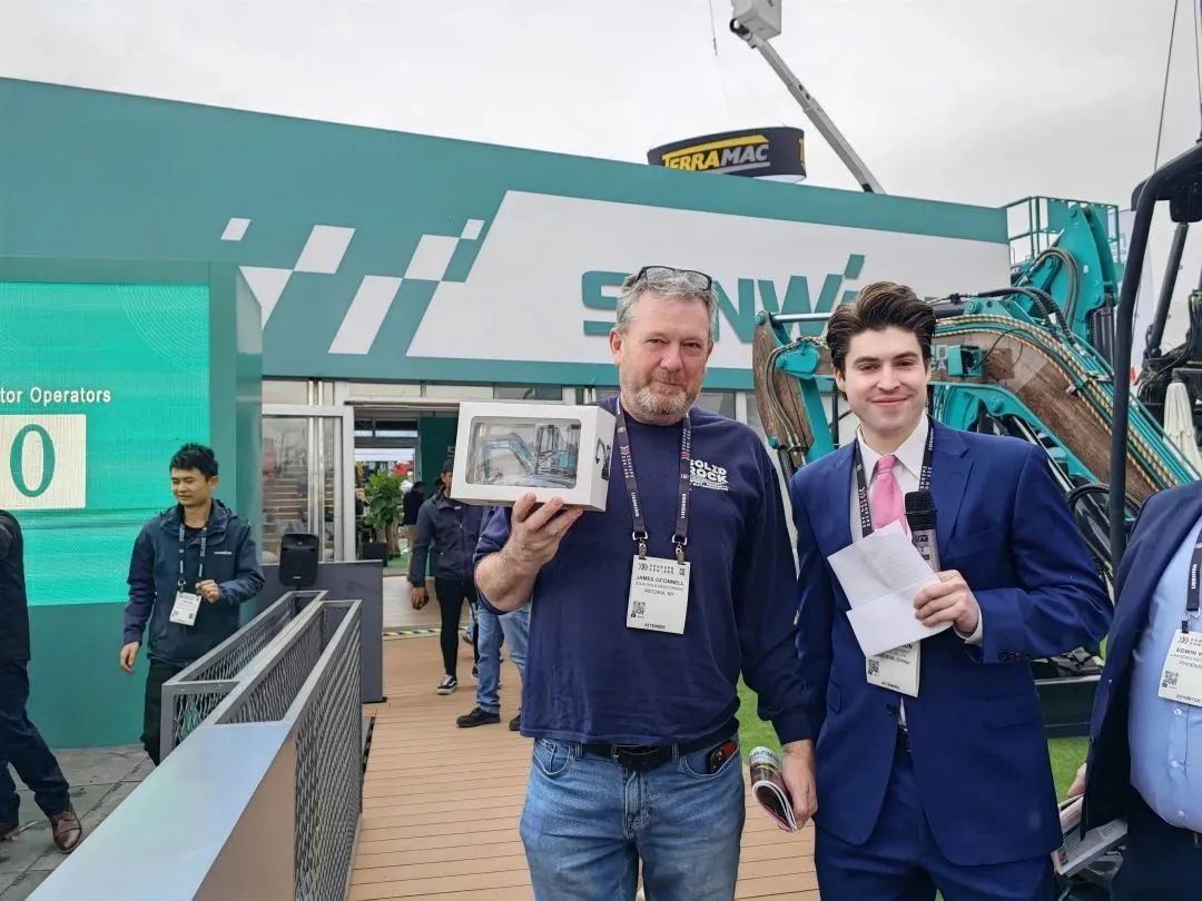 智能产品应接不暇,精彩游戏吸睛不断。一旁的游戏互动区不时传出阵阵掌声、喝彩声,只见一名观众驾驶山河智能无尾挖,操作斗齿上的工具小心翼翼地完成了多个螺母的依次堆叠,这不仅对操作者的耐心和技术是一个挑战,更考验挖掘机的稳定性和灵活性。