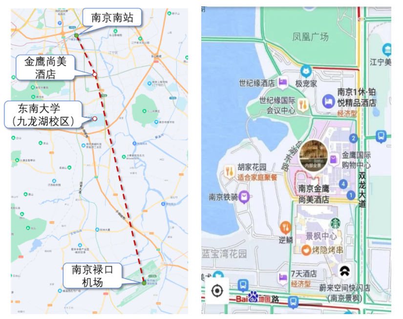 线路2:高铁南京南站:打车约20元,车程15分钟。地铁1号线直达,车程约24分钟,南京南站乘坐中国药科大学方向地铁,百家湖站1号出口,步行350米。