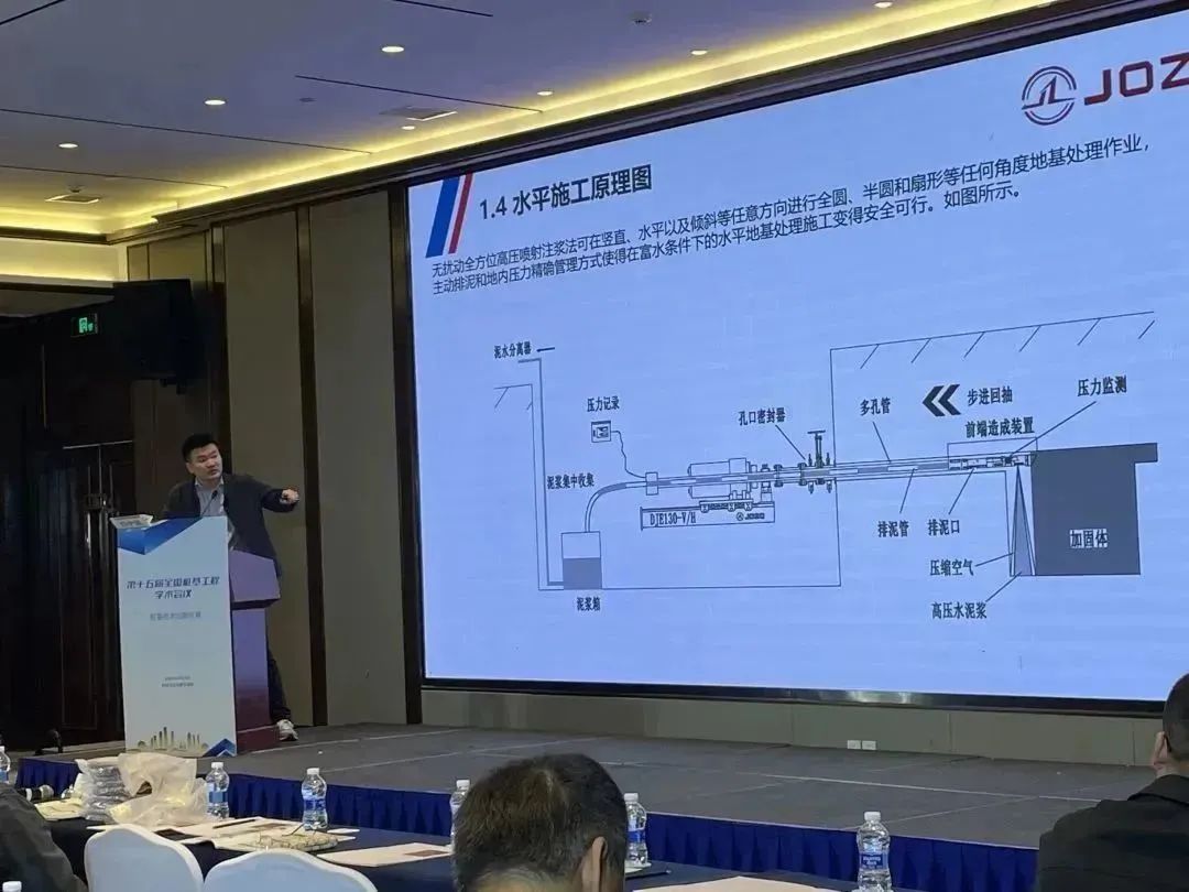 上海久卓设计工程师白中强结合上海久卓设备参与的“南京地铁7号线下穿暗挖工程”、“北京东六环改造工程联络通道项目”,“苏州轨道交通8号线时代广场站”,等多项施工案例,向参会专家学者详尽讲解了水平MJS在施工的特点和应用场景、水平MJS的整体施工原理和施工流程,并对水平MJS特性进行了数值分析。