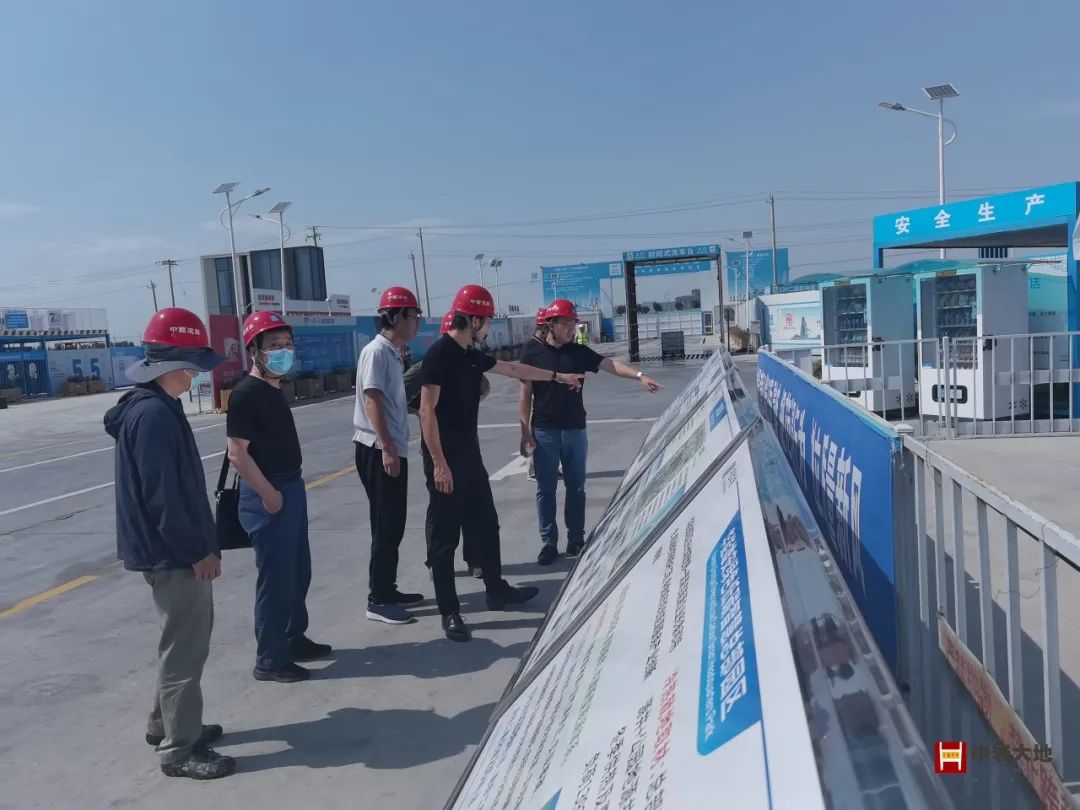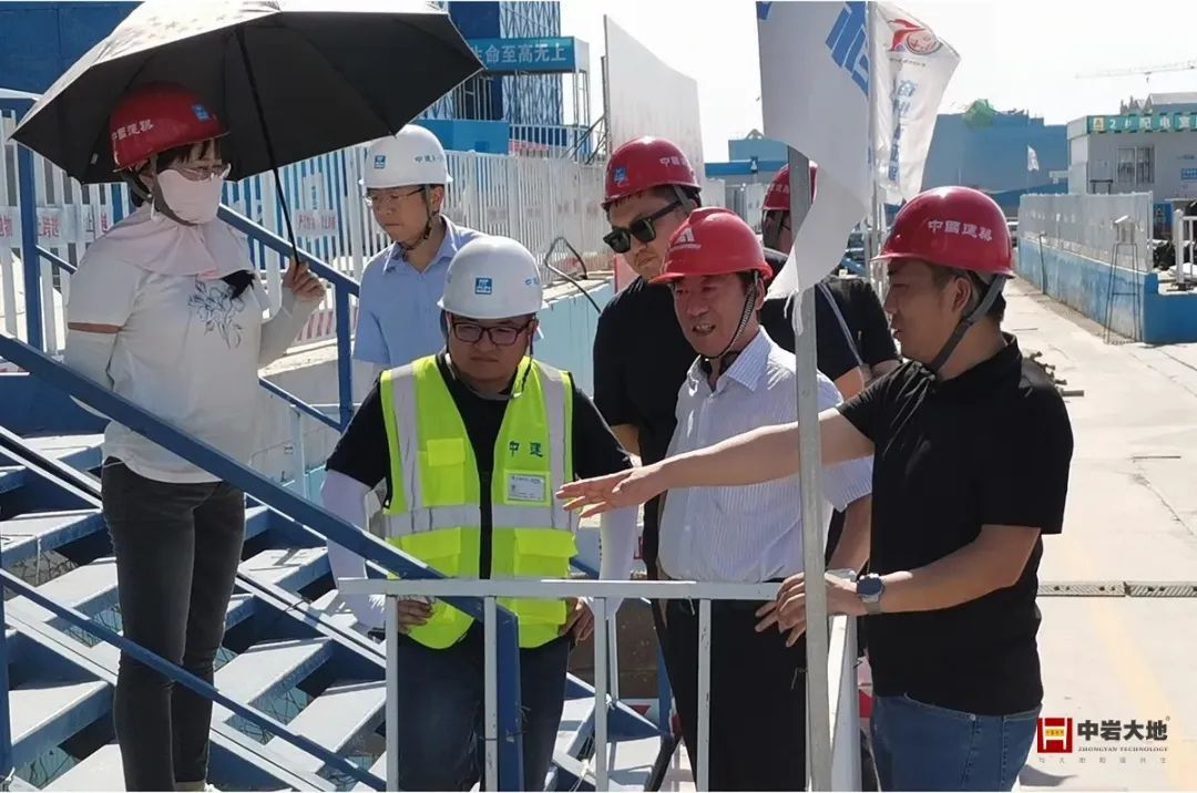 时值小暑,夏日炎炎,中国华能总部项目现场已塔吊林立,建设场面热火朝天。领导专家团怀着浓厚的兴趣,在中岩大地现场技术人员的陪同下沿线观摩项目基本情况:肥槽深度15米,宽度约1~1.5米,属于典型回填深度大、回填空间与实施场地狭小的肥槽工程;另外本项目将作为中国华能集团新总部,充分体现世界一流清洁能源企业特色与创新设计要求,通过园区基础下地源井+公园地源井+空气源满足园区冬季供热及夏季制冷需要,建设绿色零碳标杆工程,因此在肥槽内的不同区域还埋设有众多地源泵管穿出。