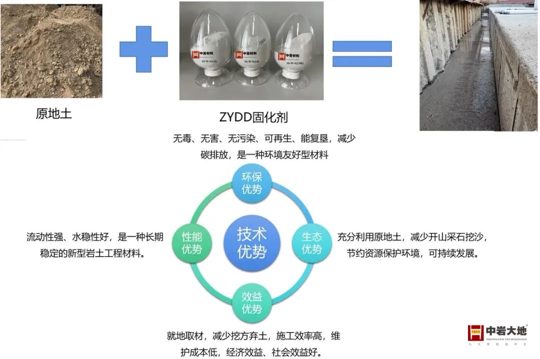 中岩大地将其技术特点向专家团进一步阐述:流态固化土通过采用现场开挖余土、废弃渣土等加入固化剂和水,搅拌成具有一定流动性的混合料用于肥槽的回填,并经浇筑、养护、硬化,最终形成具有一定强度、抗渗防水性能佳的固化土用于肥槽空间的永久填充,其机理是通过无机胶结料胶结土粒并促进固化反应,提高和改善硬化土体性能,尤其提高了强度、水稳性、抗渗性等。将流态固化土用于回填材料主要有以下四方面优势:
