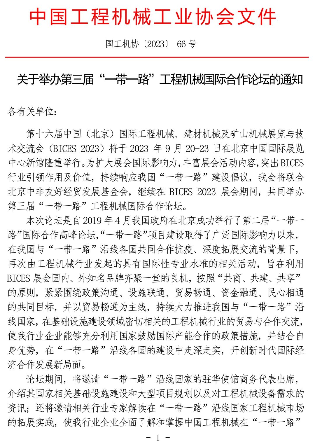 第十六届中国(北京)国际工程机械、建材机械及矿山机械展览与技术交流会(BICES 2023)将于2023 年9月20-23日在北京中国国际展览中心新馆隆重举行。为扩大展会国际影响力,丰富展会活动内容,突出BICES行业引领作用及价值,持续响应我国“一带一路”建设倡议,我会将联合北京中非友好经贸发展基金会,继续在BICES 2023 展会期间,共同举办第三届“一带一路”工程机械国际合作论坛。